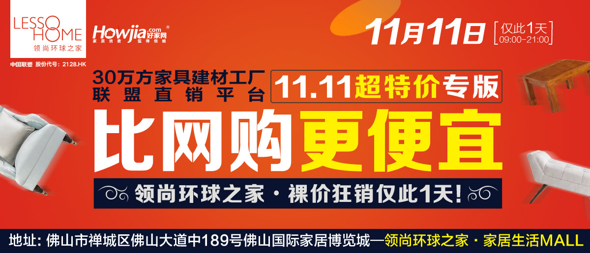家具也有双十一!11月11日佛山·领尚环球之家30万方家居工厂联盟直销平台【比网购更便宜(超特价专版)】暨家居生活MALL购物嘉年华启动!千家家居工厂联盟,百万件产品任你抢!活动当天,全场厂价特供,还有惊喜好礼等着您:55寸液晶电视、三门冰箱、电饭煲等豪礼抱回家!买厂价家具,享豪礼!广州、深圳免费大巴接送,珠三角地区自驾到场还可补贴油费,赶快报名参加活动吧!
