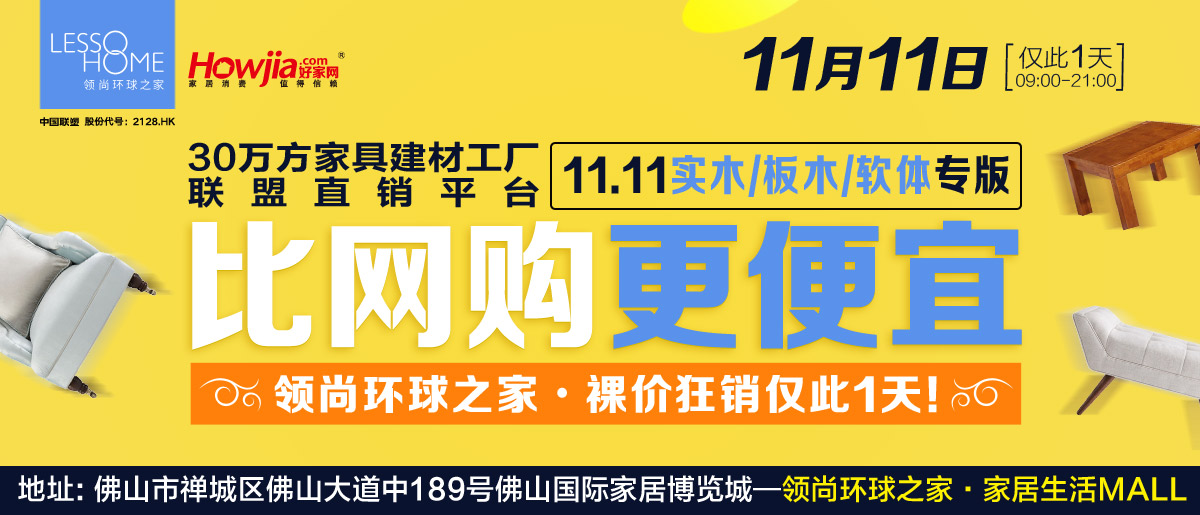家具也有双十一!11月11日佛山·领尚环球之家30万方家居工厂联盟直销平台【比网购更便宜(实木/板木/软体专版)】暨家居生活MALL购物嘉年华启动!千家家居工厂联盟,百万件产品任你抢!活动当天,全场厂价特供,还有惊喜好礼等着您:55寸液晶电视、三门冰箱、电饭煲等豪礼抱回家!买厂价家具,享豪礼!广州、深圳免费大巴接送,珠三角地区自驾到场还可补贴油费,赶快报名参加活动吧!